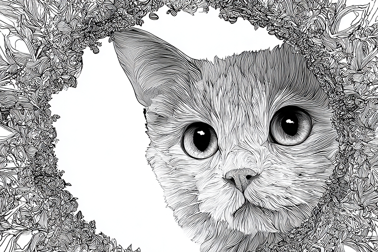 Cat peeking through a floral frame. The cat has big eyes and a playful expression, showcasing its curious nature. The intricate floral pattern surrounding the cat adds a touch of elegance and sophistication to the overall design. This illustration can be used as inspiration for art, design, and creativity.