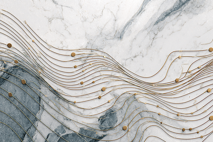 Wavy lines and gold dots set against a beautiful marble background. The artwork exudes elegance and sophistication, making it a perfect addition to any luxury interior design. The combination of metallic accents and geometric patterns creates a visually striking representation of contemporary art.