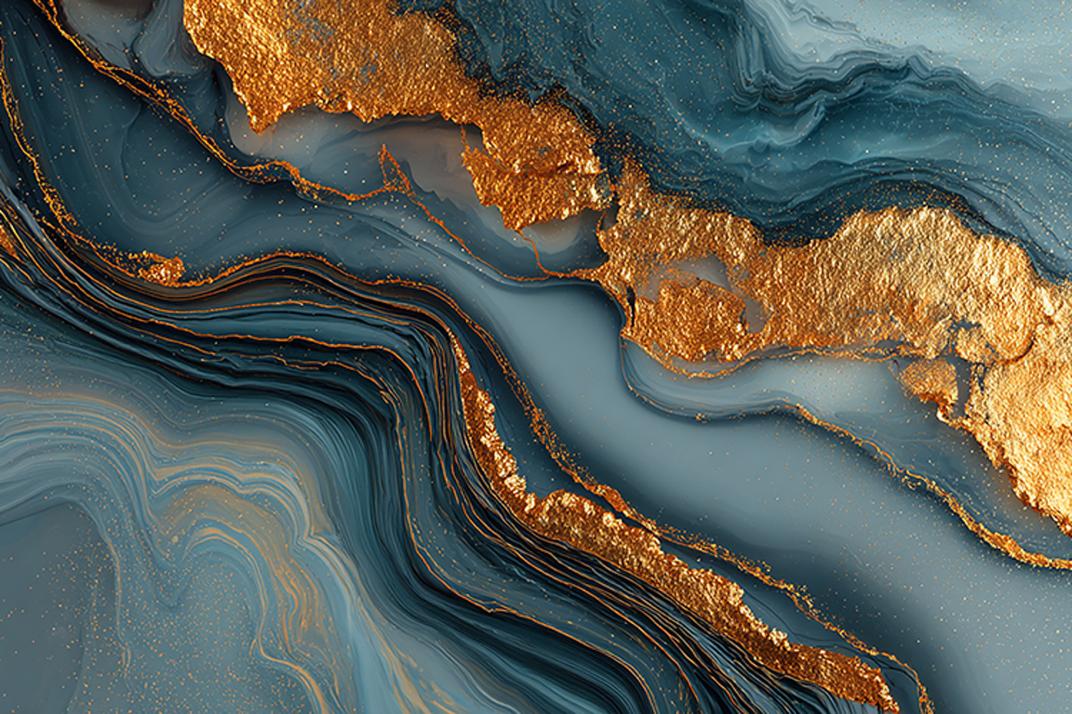 Dramatic teal and deep sea blues contrasted by heavy, molten gold leaf deposits that create a striking geological aesthetic.