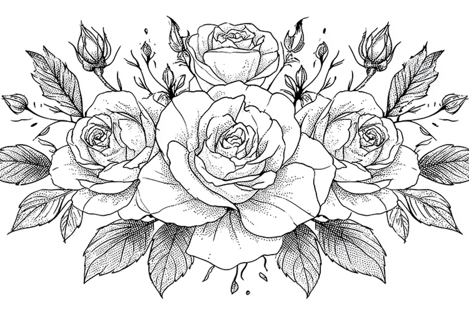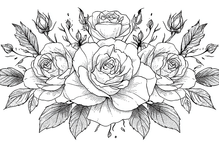 Detailed black and white line art featuring a cluster of roses and buds with stipple shading.