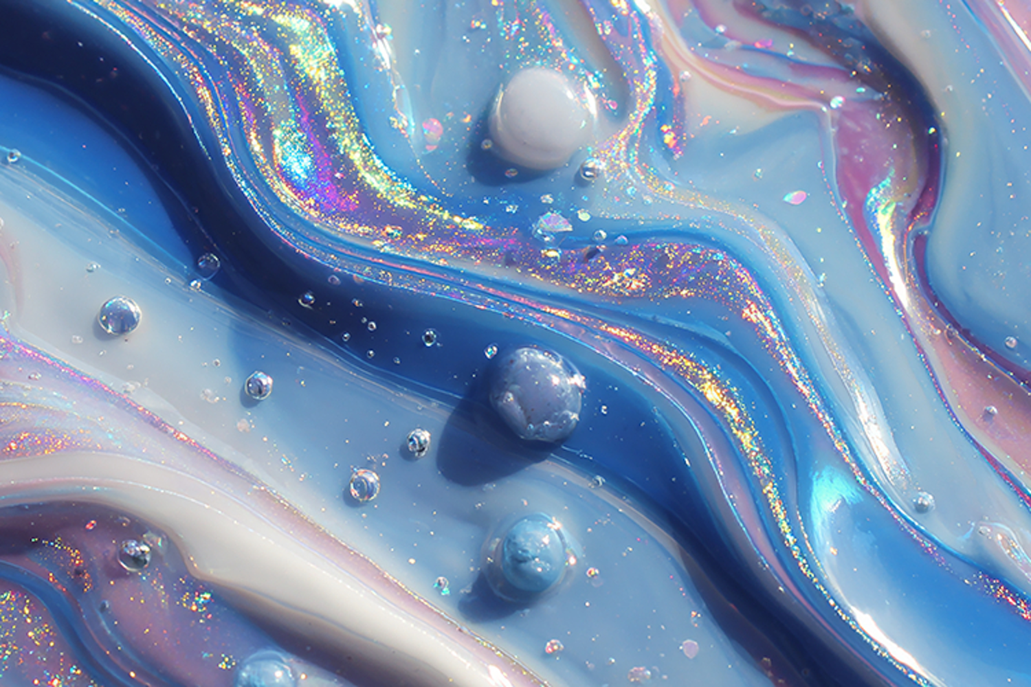 A vibrant blue liquid background with iridescent rainbow oil-slick swirls and realistic floating crystal bubbles.