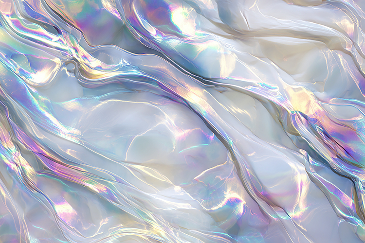 A high-resolution texture of white pearlescent fabric with soft flowing drapes and a subtle holographic rainbow glow.