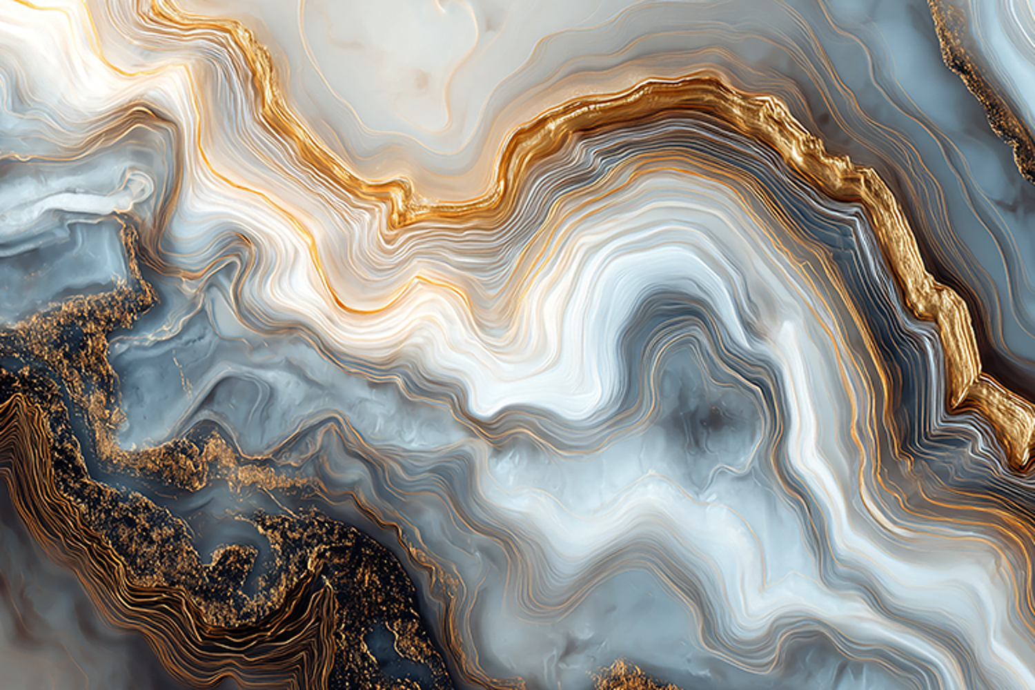 Natural white and charcoal agate stone texture featuring intricate flowing bands of shimmering golden glitter.