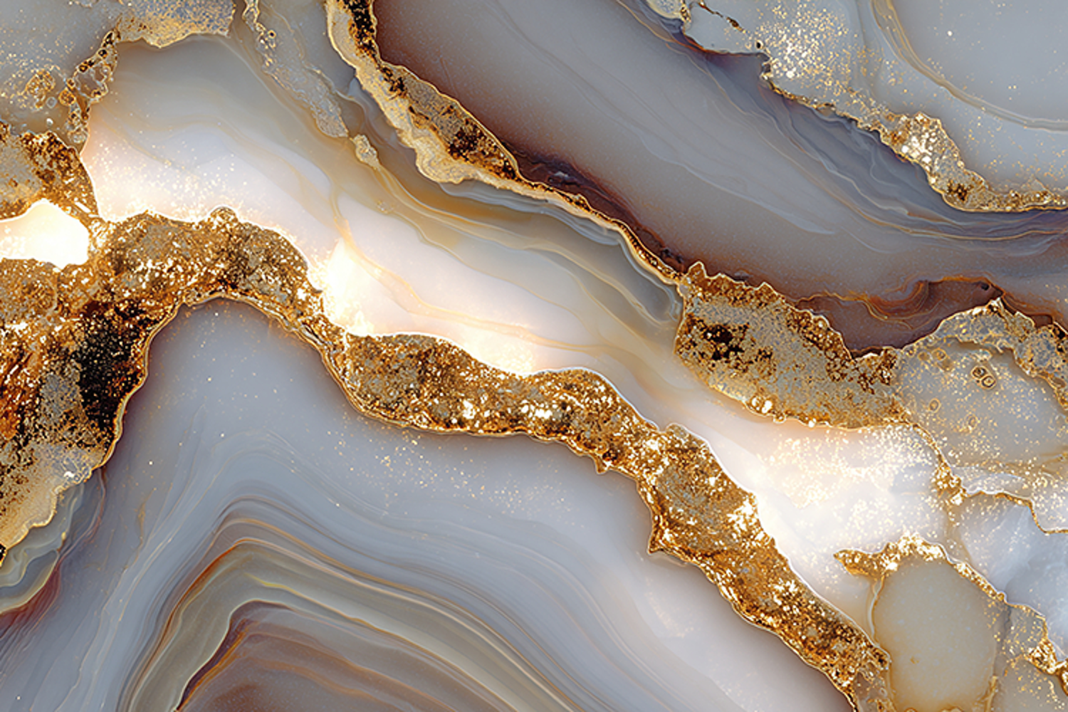 Minimalist white marble background featuring bold organic golden liquid fractures and shimmering metallic textures.