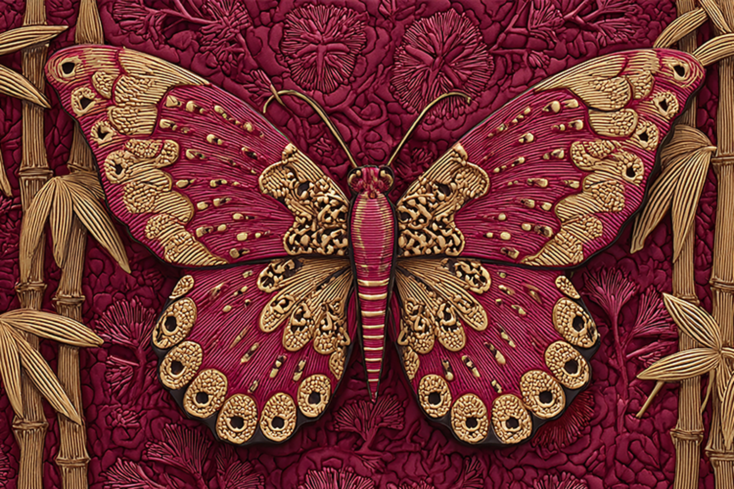 High-detail 3D-style embossed butterfly in deep magenta with ornate gold metallic filigree on a textured background.