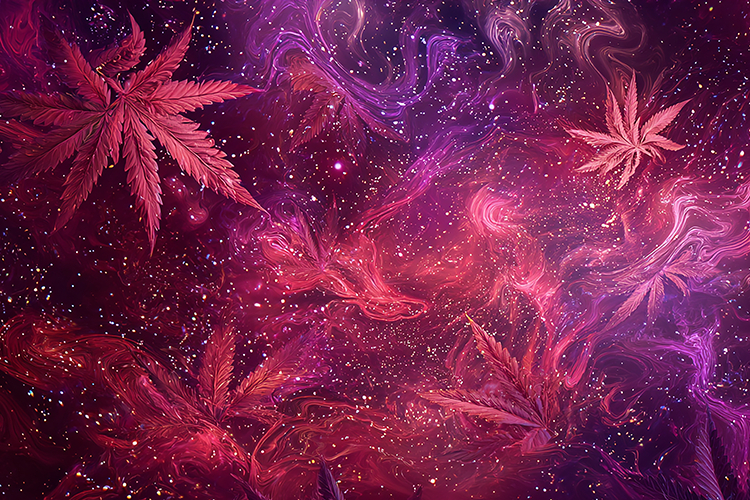 A stunning psychedelic illustration featuring cannabis leaves floating within a vibrant cosmic nebula. The design blends deep purples, magentas, and pinks with swirling celestial clouds and shimmering starfields. This high-energy, artistic background is perfect for creative projects, lifestyle branding, and modern decorative prints.