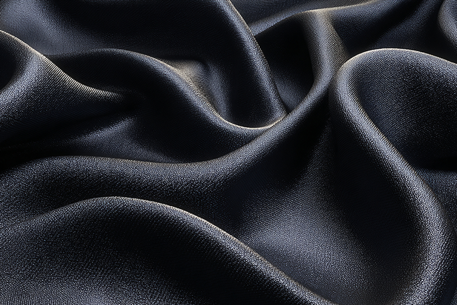 A luxurious and high-resolution texture of navy blue silk fabric featuring elegant, soft ripples and deep shadows. The subtle luster of the material highlights the graceful drapes.
