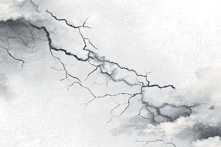A minimalist white marble composition featuring sharp, energetic graphite veins that resemble lightning strikes across the stone. The clean, monochromatic look provides a timeless and professional aesthetic for any creative project.