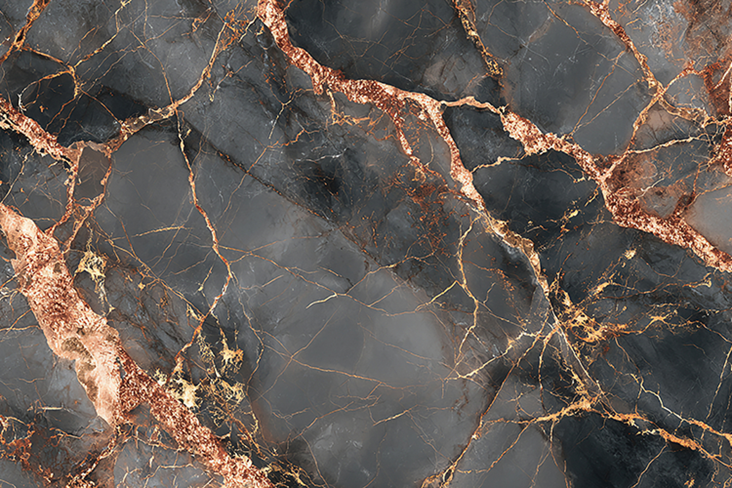 A dramatic dark grey marble texture featuring intricate rose gold and copper veins flowing across deep charcoal stone layers. The striking contrast between the dark surface and metallic cracks creates a luxurious and sophisticated aesthetic, perfect for wallpapers, digital backgrounds, textiles, and premium décor designs.