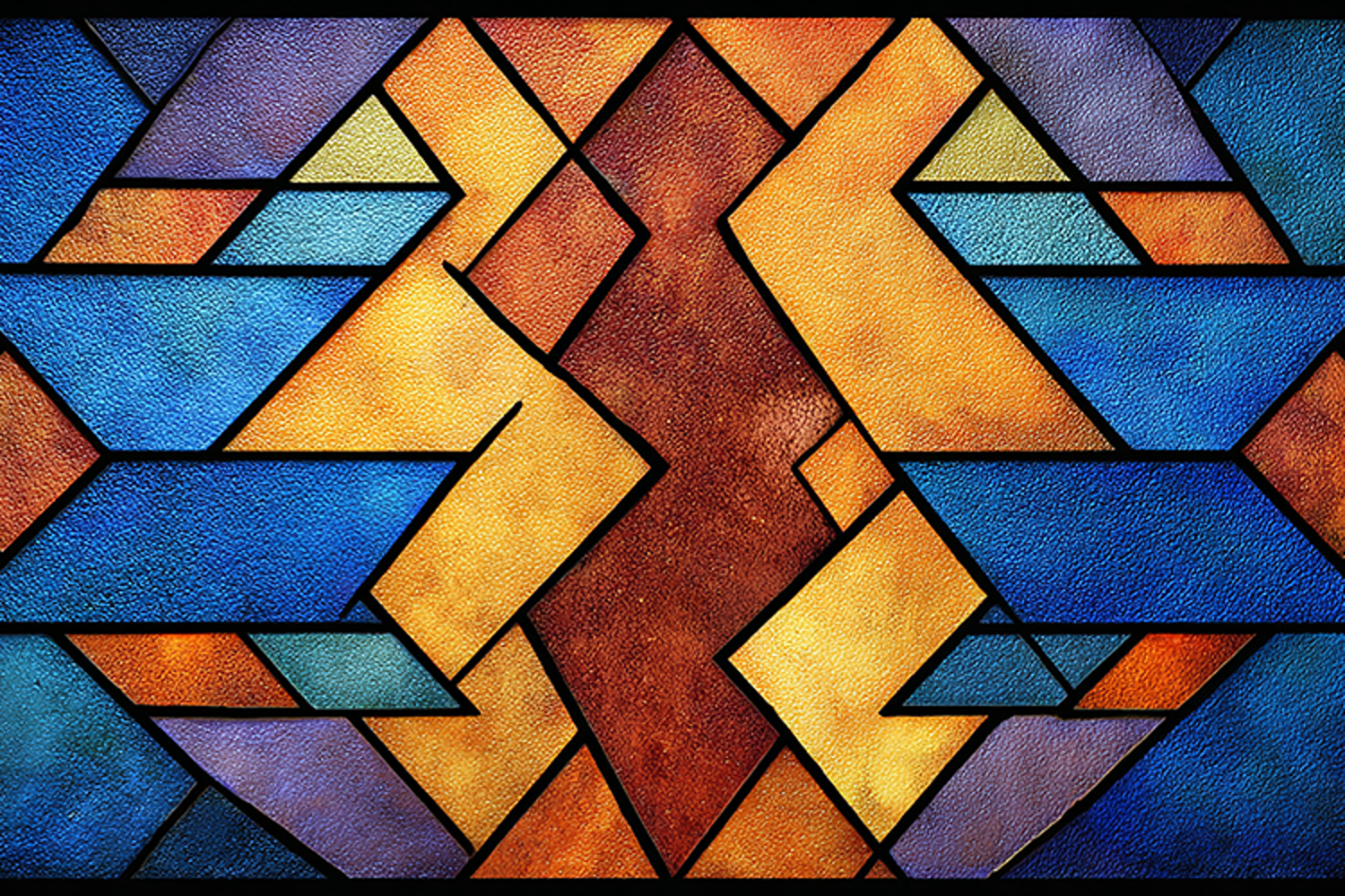Colorful geometric stained glass pattern featuring vibrant shapes and textured glass pieces. Ideal for artistic backgrounds, decorative wallpapers, window-inspired designs, and modern abstract decor.