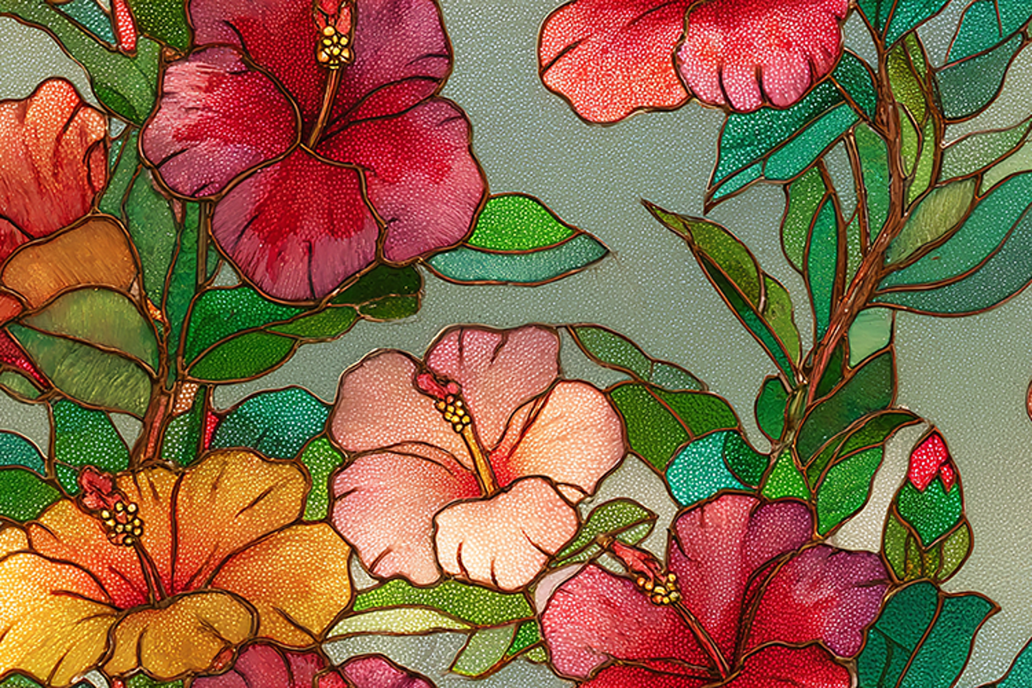Vibrant hibiscus floral stained glass artwork featuring colorful tropical flowers and decorative leaves. Perfect for artistic backgrounds, wallpapers, botanical designs, and elegant decorative projects.
