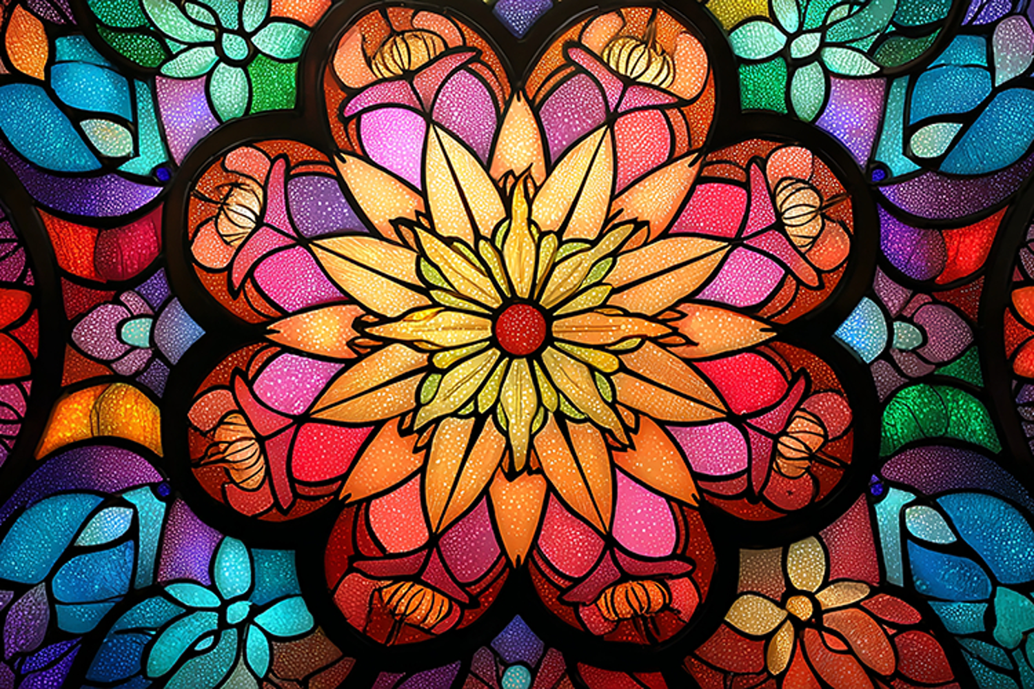 Beautiful colorful stained glass mandala featuring a radiant floral design with vibrant petals and decorative patterns. Perfect for artistic backgrounds, wallpapers, spiritual designs, and elegant decorative projects.