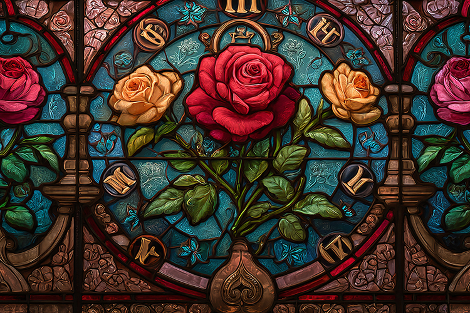 Beautiful vintage stained glass window featuring elegant roses in a decorative circular design. Perfect for romantic backgrounds, wallpapers, floral artwork, and classic decorative interior projects.