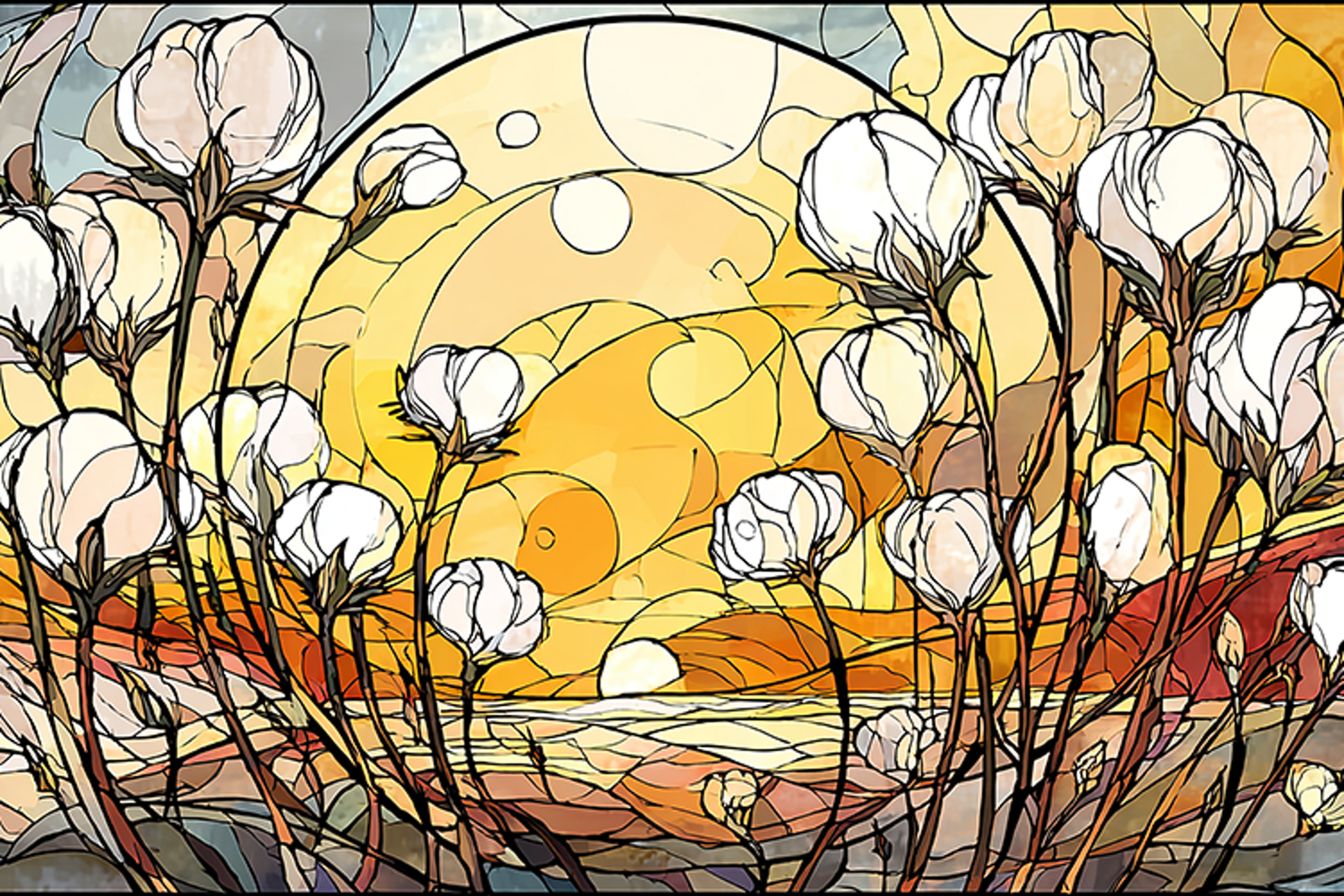 Beautiful stained glass style artwork featuring delicate magnolia flowers set against a glowing sunset landscape. Perfect for floral decor, artistic prints, nature-inspired designs, and elegant wallpapers.