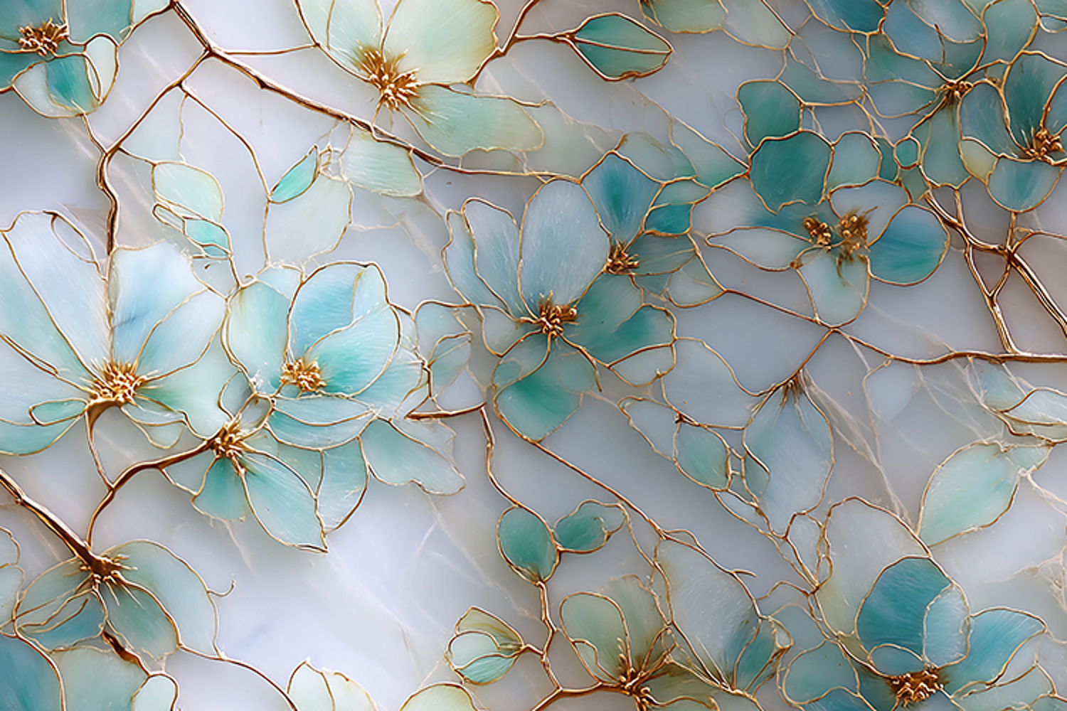 Elegant teal floral pattern featuring delicate blossoms and fine golden outlines on a soft background. Perfect for luxury wallpapers, textiles, branding, and decorative design projects.