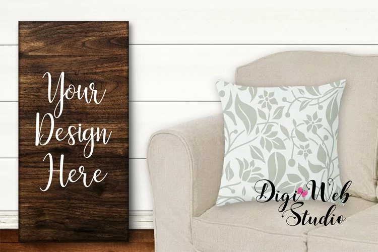 Wood Sign Mockup - Rectangle Wood Sign With Couch and Pillow