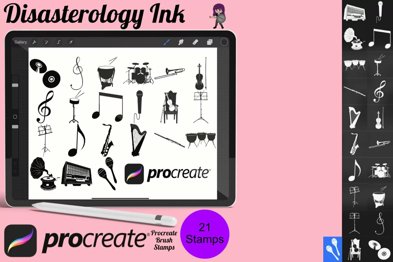 Pack of 21 music icons Procreate Stamp Brushes! These musical instruments and icon stamps are perfect for making illustration projects or any procreate purpose. You can use these in any colour or opacity and they can be resized to best fit your art.