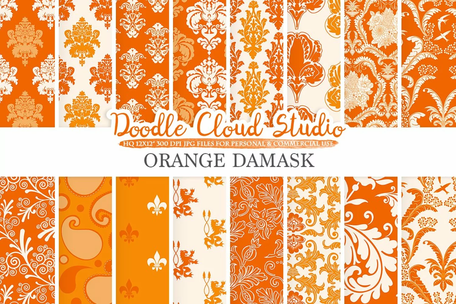 Orange Damask digital paper, Swirls patterns, Digital Floral Damask, Orange backgrounds, Instant Download for Personal & Commercial Use.