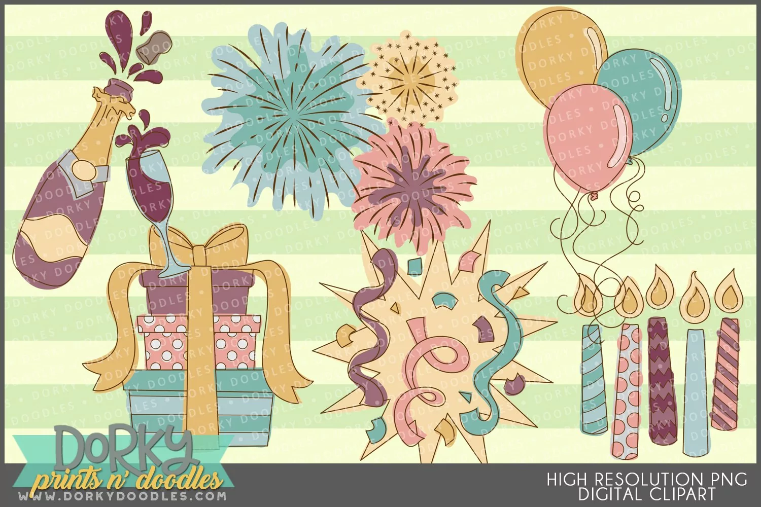 These cute celebratory images look fabulous in scrapbooks, planners, party invitations, on sublimation prints, cookies, stickers, and decor! You will get 6 Digital Clip Art images in high resolution PNG format (they come as a ZIP file that you can download instantly once payment has cleared).