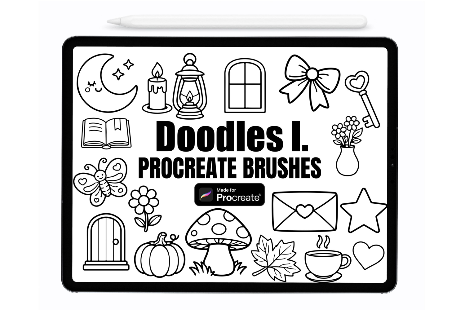 Set of 20 doodle-style stamp brushes, perfect for creating cute illustrations, cozy designs, planner stickers, line art prints, coloring pages, and digital stationery.