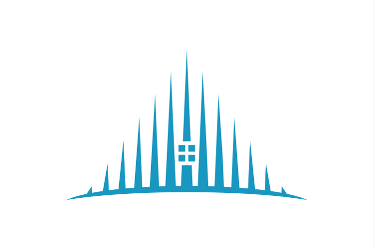 A distinctive, modern logo featuring an abstract representation of a house or building. The structure is composed of multiple sharp, vertical spire-like elements in a light blue or cyan color, suggesting height, quality, or perhaps an ice-like/cold weather environment. A small, square shape in the center acts as a window. The base is a curved line, giving the impression of a solid foundation or landscape. This design is highly suitable for real estate agencies, property development, architecture firms, or brands specializing in cold-weather products/services.