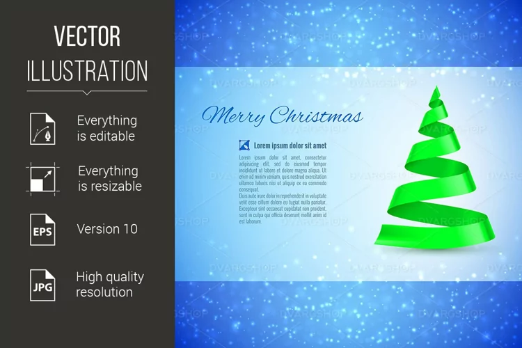 Christmas greeting card with green ribbon Christmas tree over sparkling background
