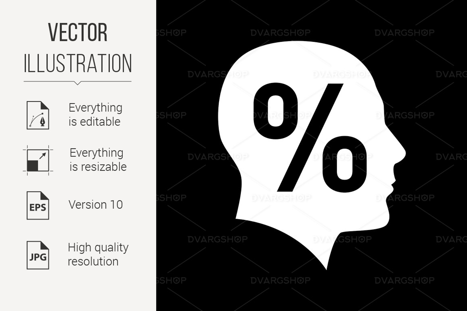 Icon of Human Head Silhouette with Percentage Sign. Illustration on Black Background