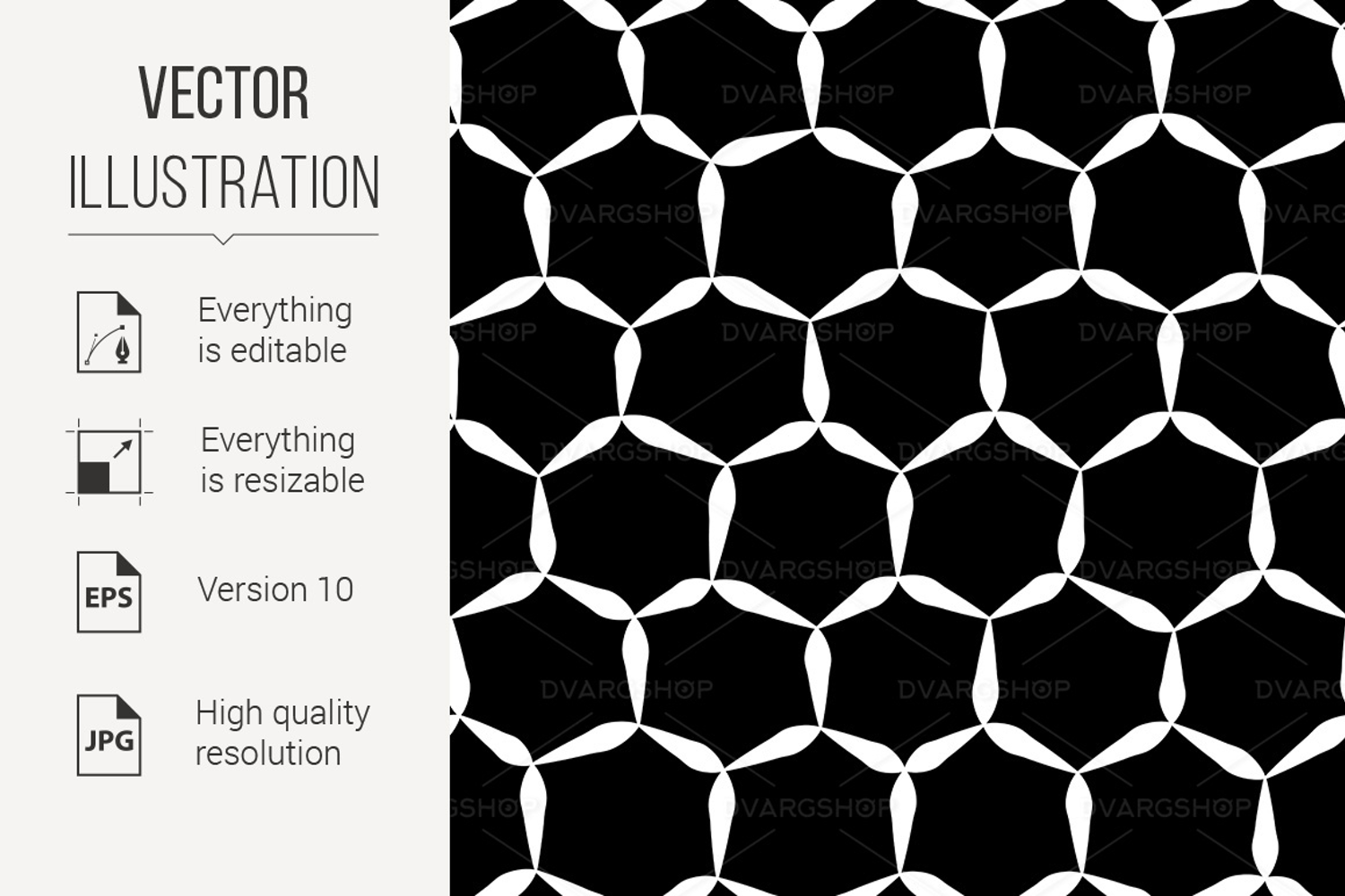 A bold black and white seamless pattern featuring a honeycomb motif in a mesh-like design on black background