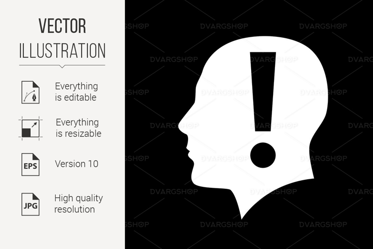 Icon of Human Head Silhouette with Exclamation Sign. Concept Illustration Solution on Black