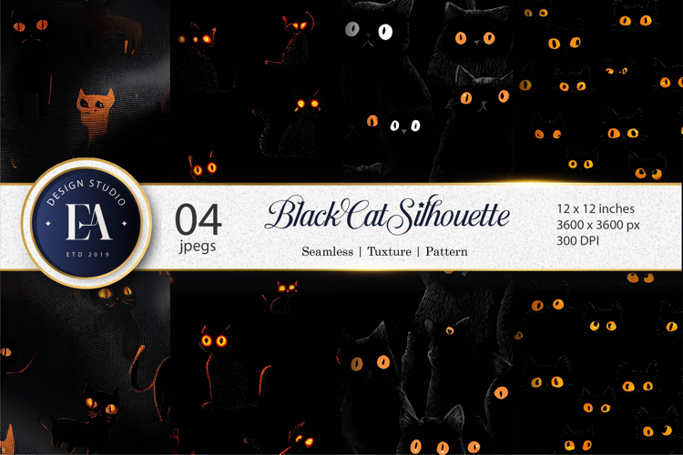Spooky Black Cat Silhouettes Seamless Tileable Digital Paper. A hauntingly stylish design featuring sleek black cat shapes on subtle backgrounds — perfect for Halloween crafts, gothic themes, party invitations, spooky décor, and digital projects.