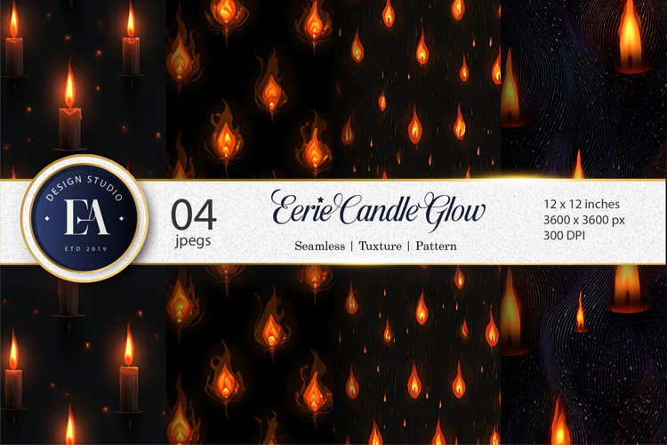 Eerie Candle Flames Spooky Glow Seamless Tileable Digital Paper. A hauntingly elegant design featuring glowing candle lights flickering in eerie tones, perfect for Halloween crafts, gothic décor, invitations, and mystical art projects.
