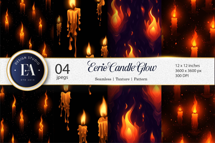 Eerie Candle Flames Spooky Glow Seamless Tileable Digital Paper. A hauntingly elegant design featuring glowing candle lights flickering in eerie tones, perfect for Halloween crafts, gothic décor, invitations, and mystical art projects.
