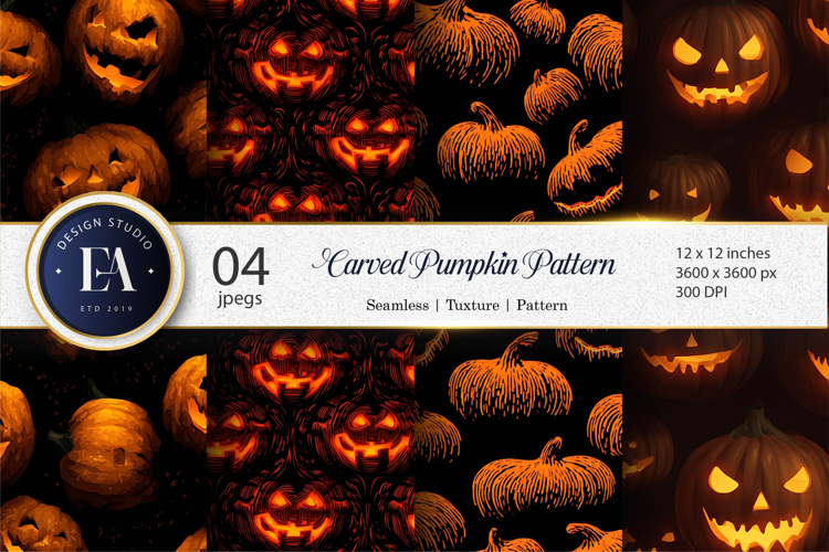 Carved Halloween Pumpkins Pattern Seamless Tileable Digital Paper. A glowing festive design of carved jack-o’-lantern faces, blending eerie charm and fall warmth — perfect for Halloween crafts, party décor, and spooky-themed designs.