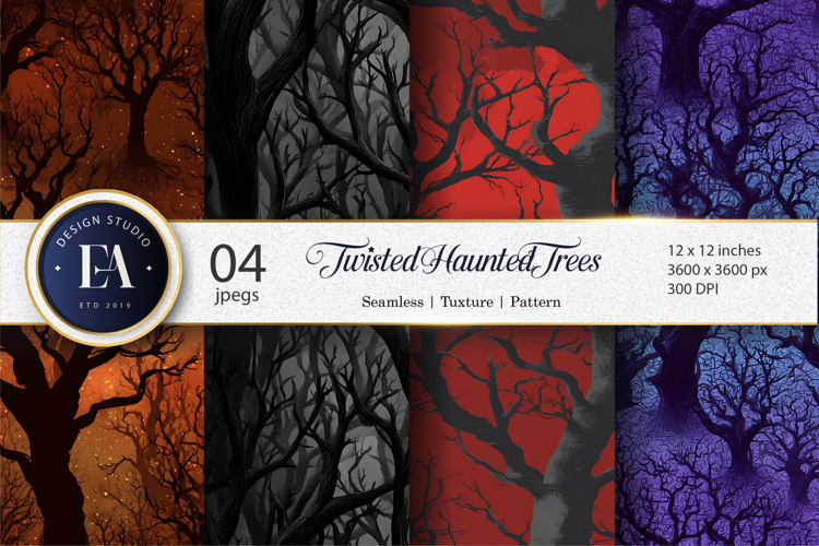 Twisted Haunted Trees Seamless Digital Paper. A spooky and detailed pattern featuring eerie, twisted tree silhouettes—perfect for Halloween crafts, gothic art, invitations, and eerie digital backgrounds.