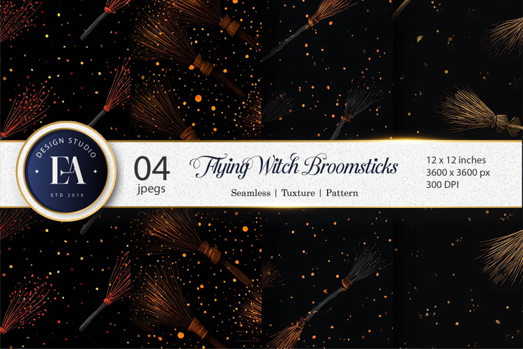 Flying Witch Broomsticks Seamless Digital Paper. A spooky and fun pattern featuring witches’ broomsticks flying across the night sky — perfect for Halloween crafts, party décor, invitations, gothic stationery, and digital backgrounds.