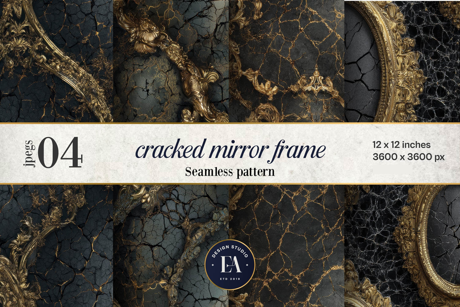 Cracked Mirror Frame Pattern | Black Gold Baroque is perfect for your creative and crafty projects. It can be used in Gift Wrapping, Promotional Items, Invitations, Wallpaper, Greeting Cards, Planners, Journals, Scrapbook, Notebook Covers, T-Shirts, Mugs, Tumbler, Puzzles, Crafting and much more,