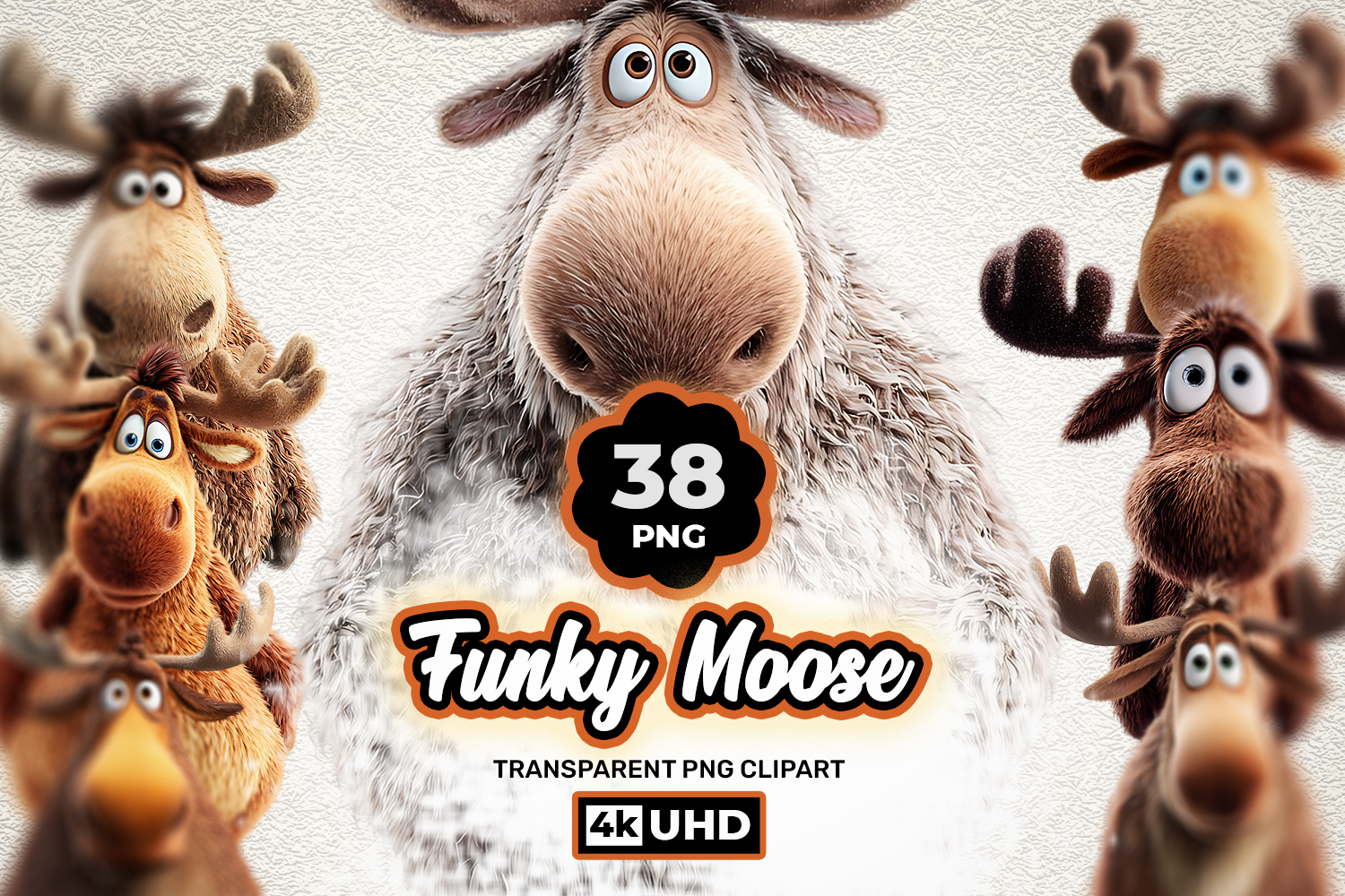 This bundle includes 38 high-quality funky moose illustrations featuring funny cartoon moose with big noses, playful expressions, fluffy fur, and vibrant details. These adorable moose characters are perfect for stickers, kids designs, sublimation printing, scrapbooking, nursery decor, and print-on-demand products.
