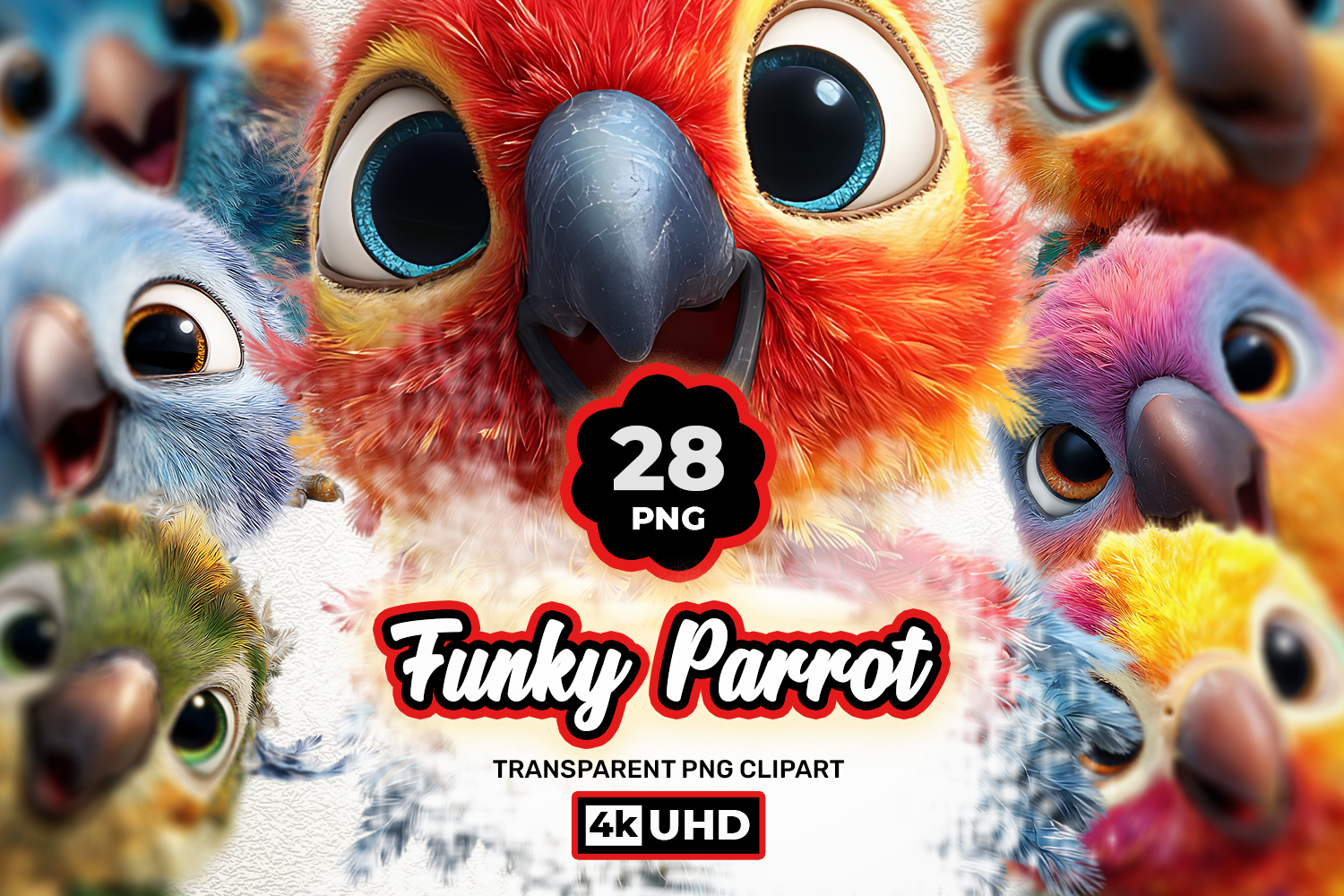 This bundle includes 28 high-quality funky parrot illustrations featuring colorful cartoon parrots with bright feathers, big expressive eyes, playful poses, and vibrant tropical details. These adorable parrot characters are perfect for stickers, kids designs, sublimation printing, scrapbooking, nursery decor, and print-on-demand products.