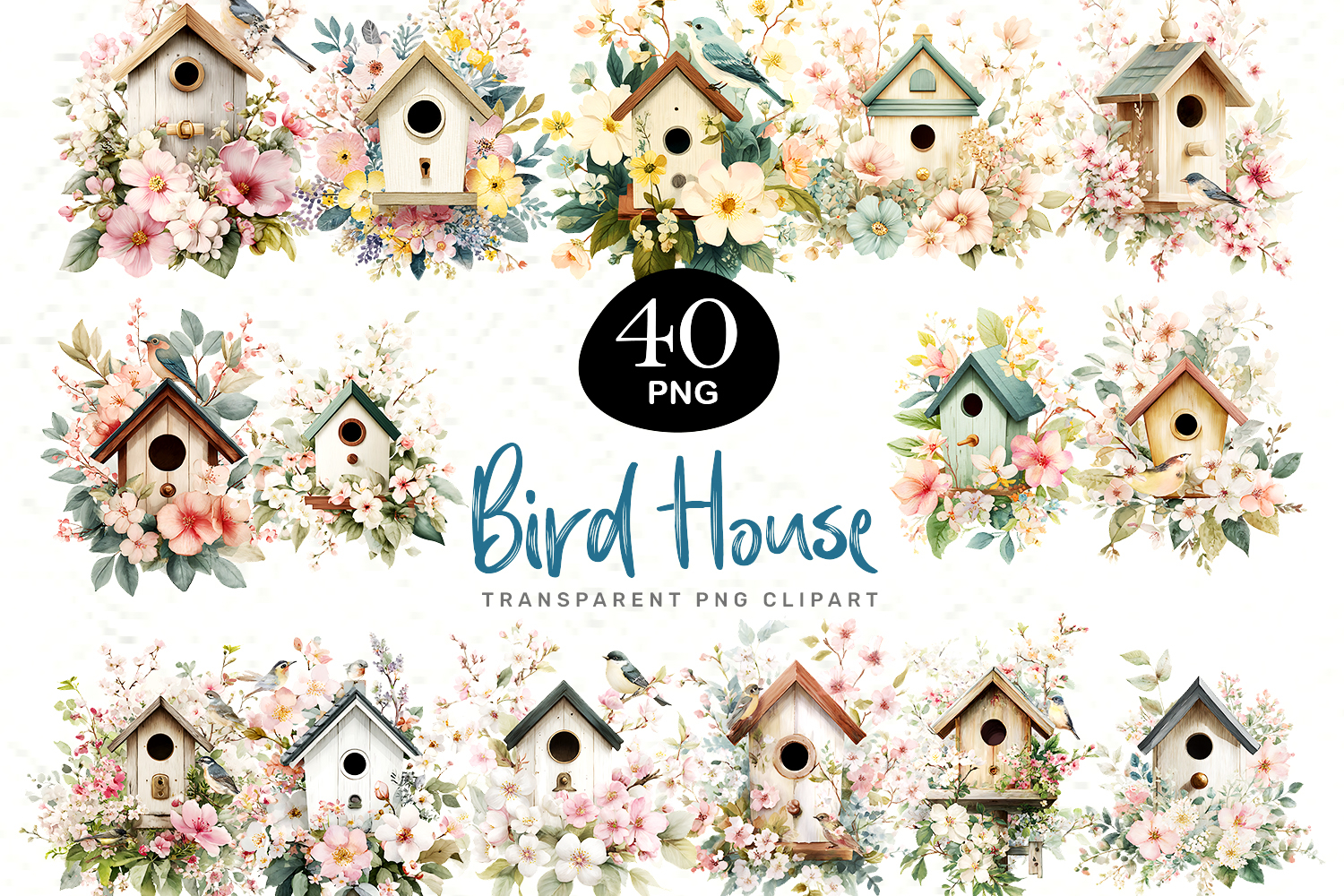 This collection includes 40 beautifully illustrated birdhouses surrounded by delicate flowers, greenery, and pastel tones in a dreamy watercolor style. Perfect for spring themes, cottagecore designs, nursery art, and handmade crafts.