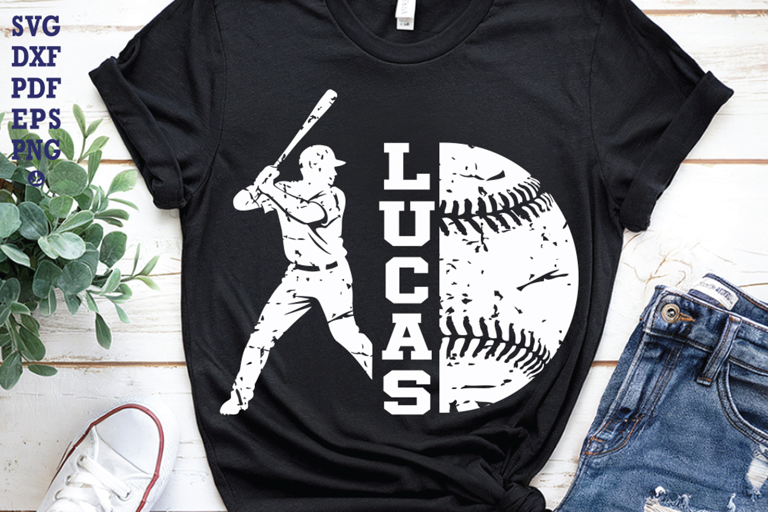 Create a bold sports look with this custom baseball graphic design featuring a dynamic batter silhouette, varsity-style vertical name lettering, and a classic half-baseball stitch element. The clean high-contrast layout gives the design a timeless athletic feel, making it perfect for players, fans, team supporters, or everyday casual wear.