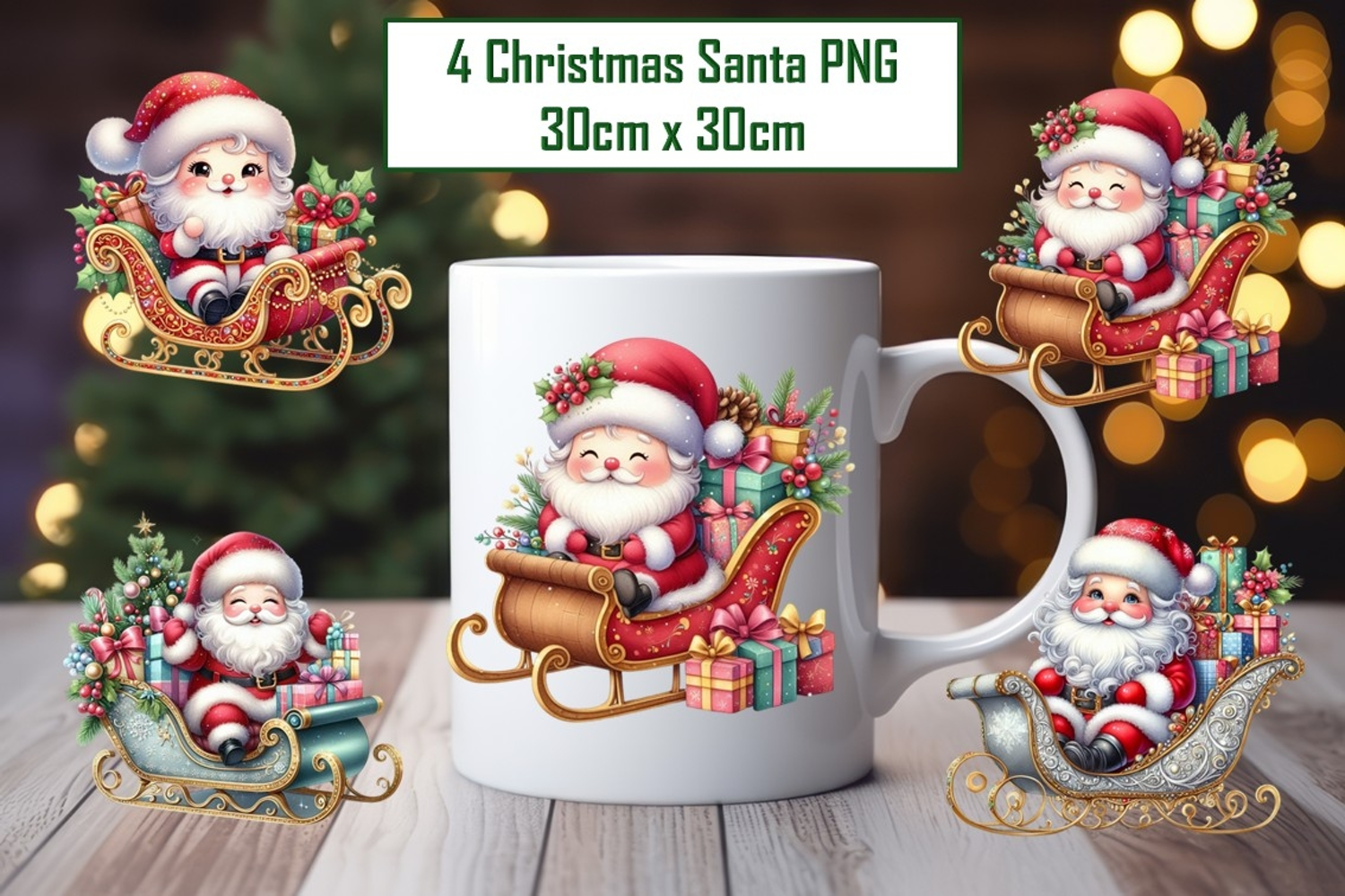 This large Christmas Santa Sublimation PNGs Feature four different Santa in a sleigh .The sublimation is in high resolution PNG format and measures approx 30cm x 30cm (12x12 inches). It can be resized to meet your needs