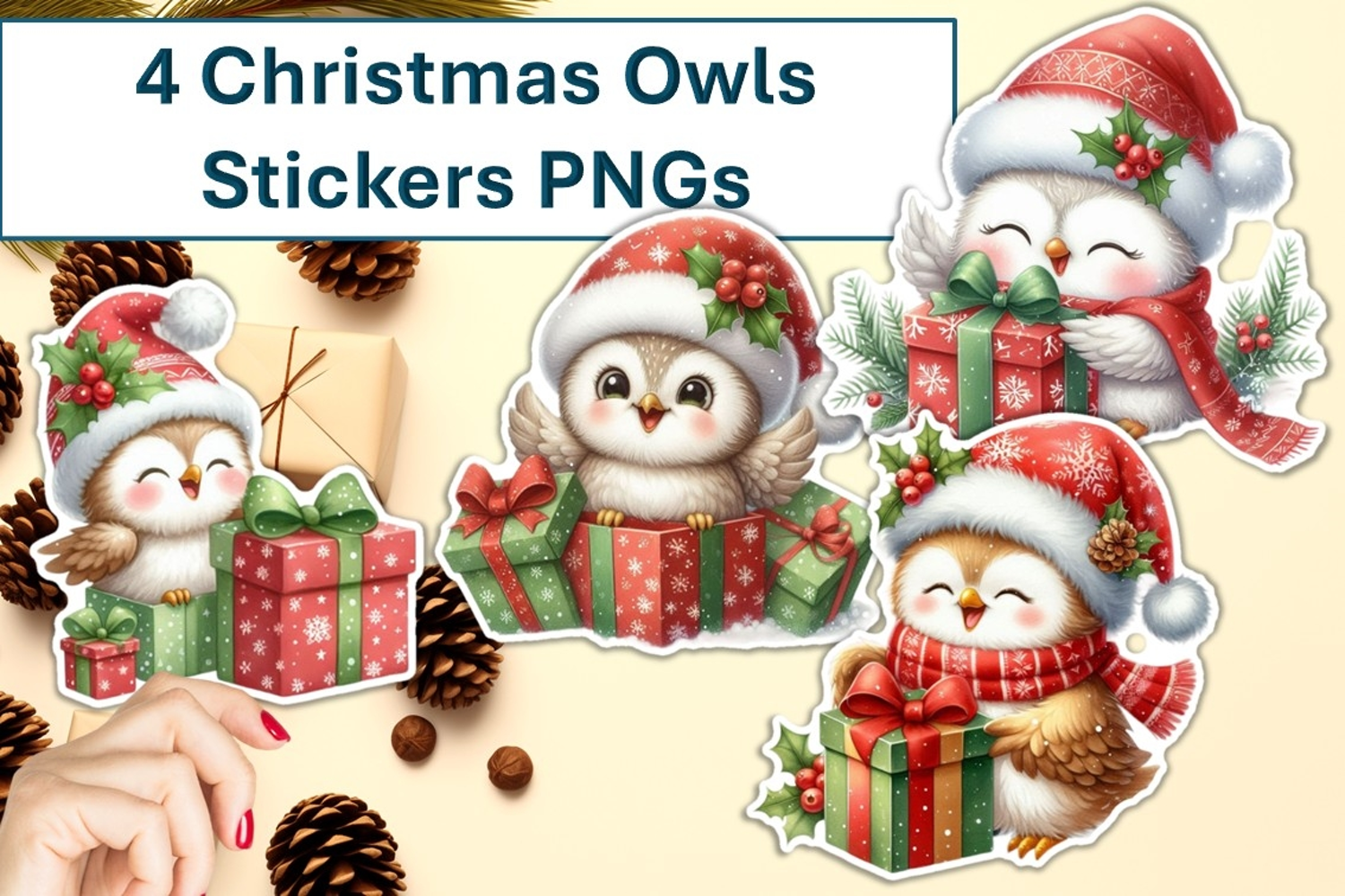 This Cute Christmas Owls with presents Sticker PNGs Feature four different Owls. The files are in high resolution PNG format and measures approx 20cm x 20cm. They can be resized to meet your needs