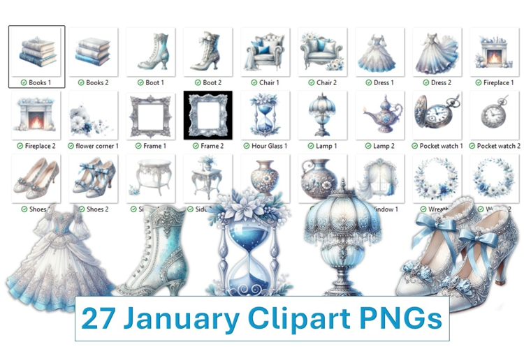 This pack of 27 January Winter clipart are in PNG format and are 2000 x 2000 pix. They are saved in high resolution format. The clipart pack contains vintage images of pocket watches, vase, chair, boots, books, dresses, fire places, frames. shoes, hourglasses, lamps, tables, window, wreaths.