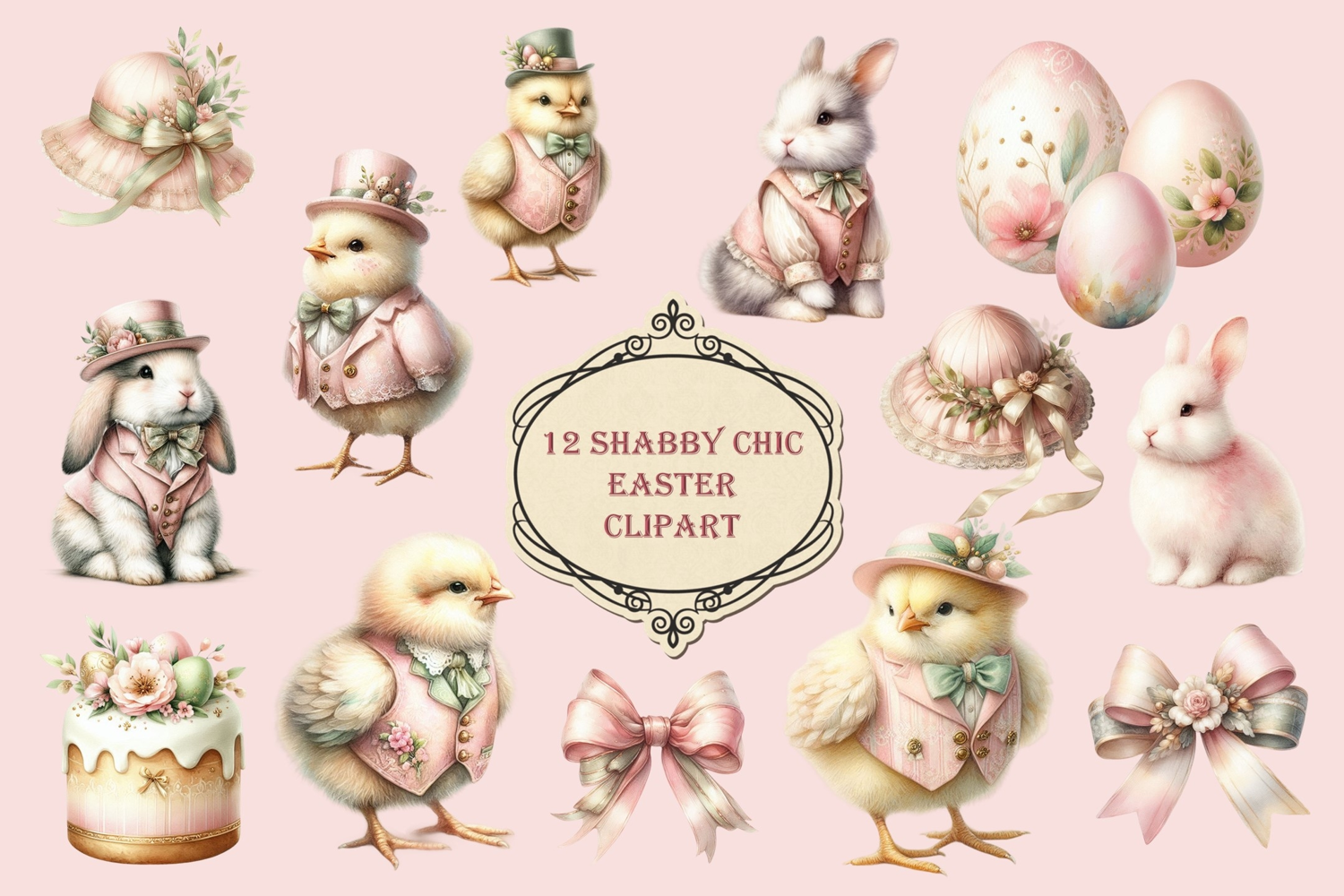 This set of 12 Shabby Chic Easter clipart contains Easter Bunnies, Chicks, Easter Eggs, bows, cake and Easter Bonnets. They are ideal for making card designs, scrapbooks, journals, planners and stationary products, The 12 files come in individual PNGs