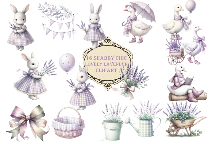 This set of 16 Shabby Chic Lovely Lavender clipart contains 4 different Lavender Geese, 4 Different Lavender Bunnies, bows, ballon, wheelbarrow, flowers, watering can. They are ideal for making card designs, scrapbooks, journals, planners and stationary products and nursery items, The 16 files come in individual PNGs