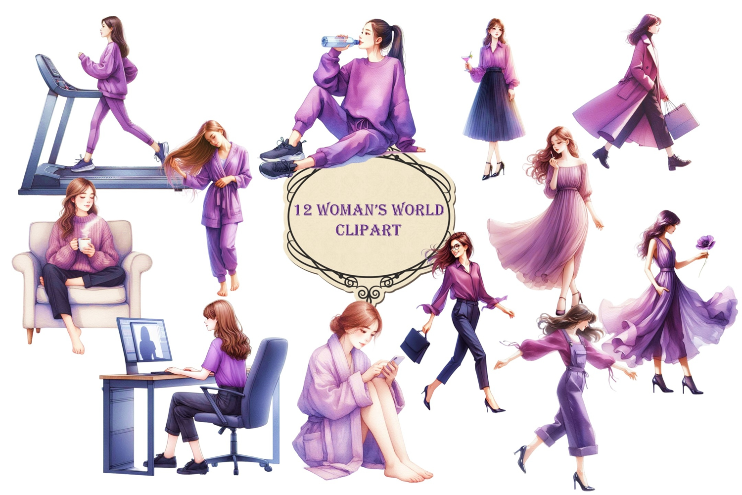 This set of 12 Shabby Chic Womans World clipart contains Active women dressed in purple. Woman working, shopping, on phone, at her desk, dancing, drinking water, having cocktail, exercising. They are ideal for making card designs, scrapbooks, journals, planners and stationary products and nursery items, The 35 files come in individual PNGs