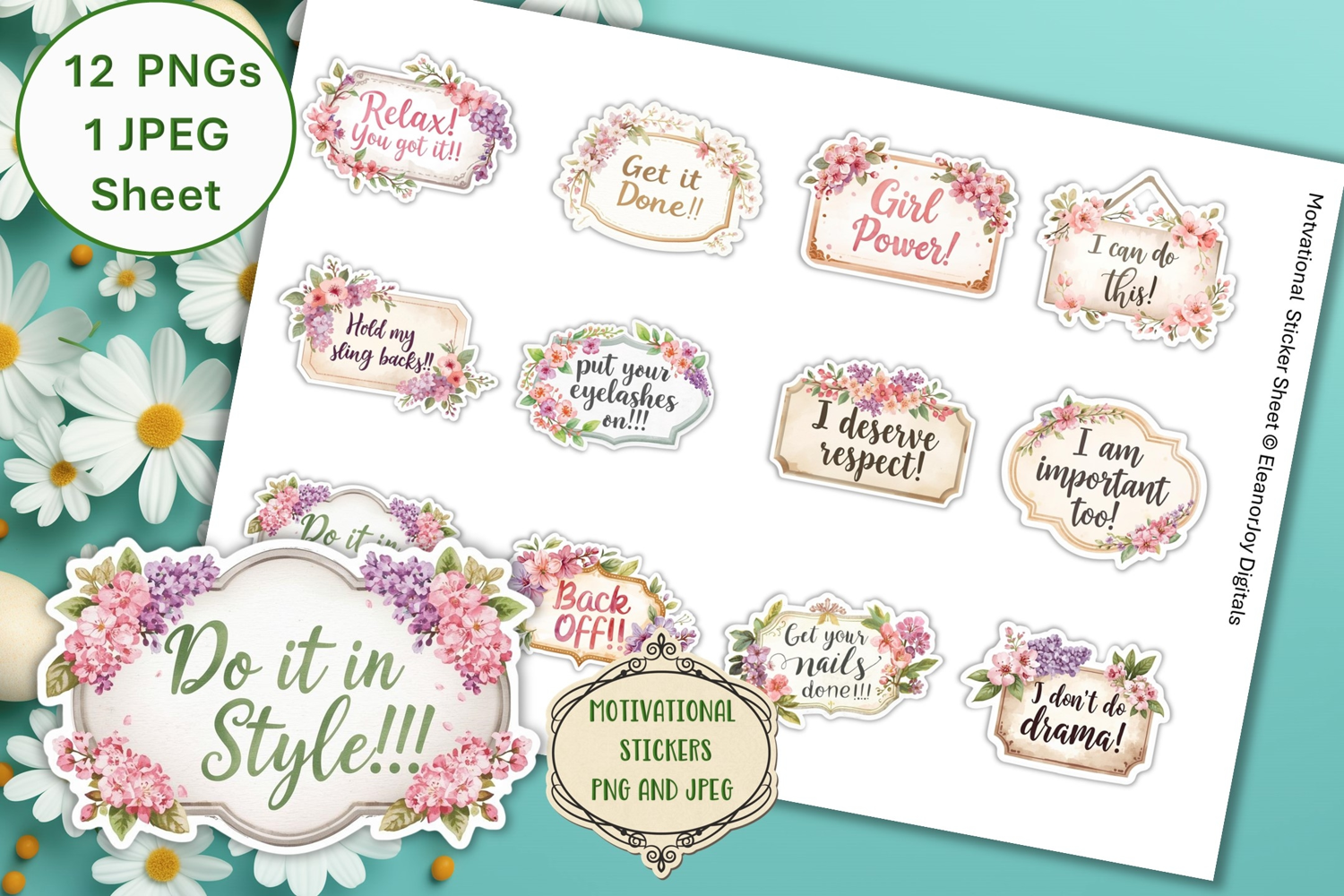 This set of 12 shabby chic motivational stickers contains cute motivational sayings such as You've got this, I don't do drama, Hold my sling-backs, I'm important too, Get your nails done, put your eyelashes on, Relax, I've got this, They are ideal for making card designs, scrapbooks, journals, planners and stationary products and nursery items, The 12 files come in individual PNGs and we have included a printable sticker sheet in JPEg format