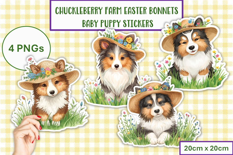Chuckleberry Willow Farm is having an Easter Bonnet Parade. Here are the cute baby Puppies in their finest Easter Hats. There are 4 stickers, Fussy Cuts measuring 20cm x 20cm, 300DPI.