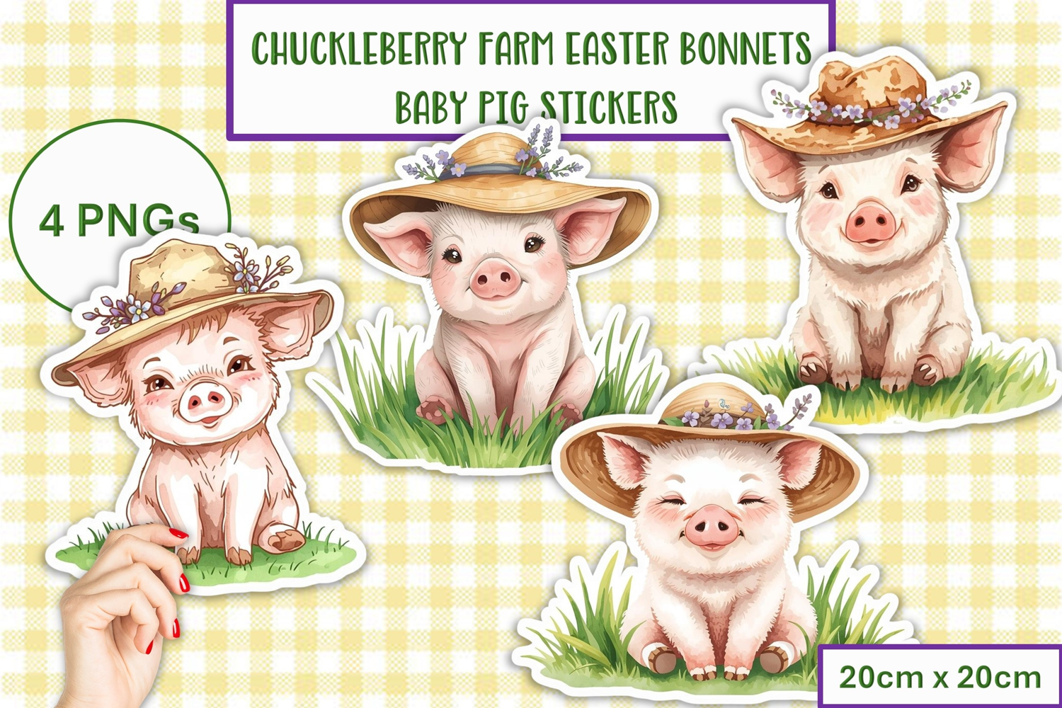 Chuckleberry Willow Farm is having an Easter Bonnet Parade. Here are the cute baby Pigs in their finest Easter Hats. There are 4 stickers, Fussy Cuts measuring 20cm x 20cm, 300DPI.