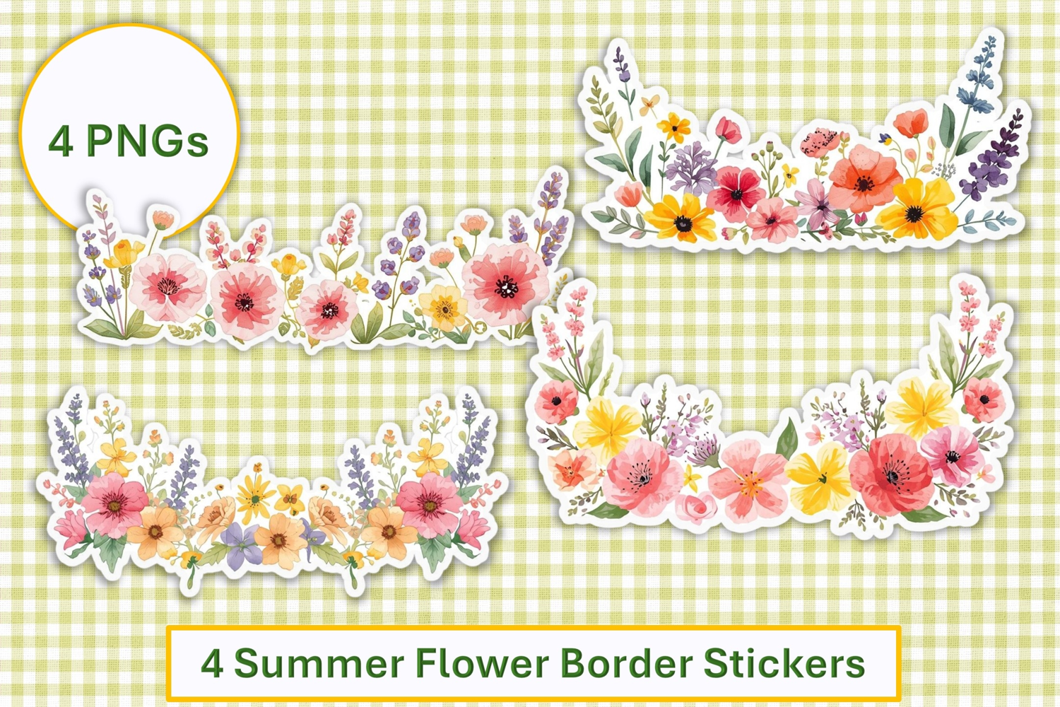 The stickers feature different summer flower page borders. The come in high resolution 300dpi PNG format on transparent background.